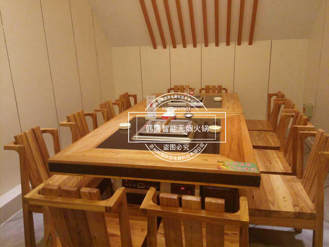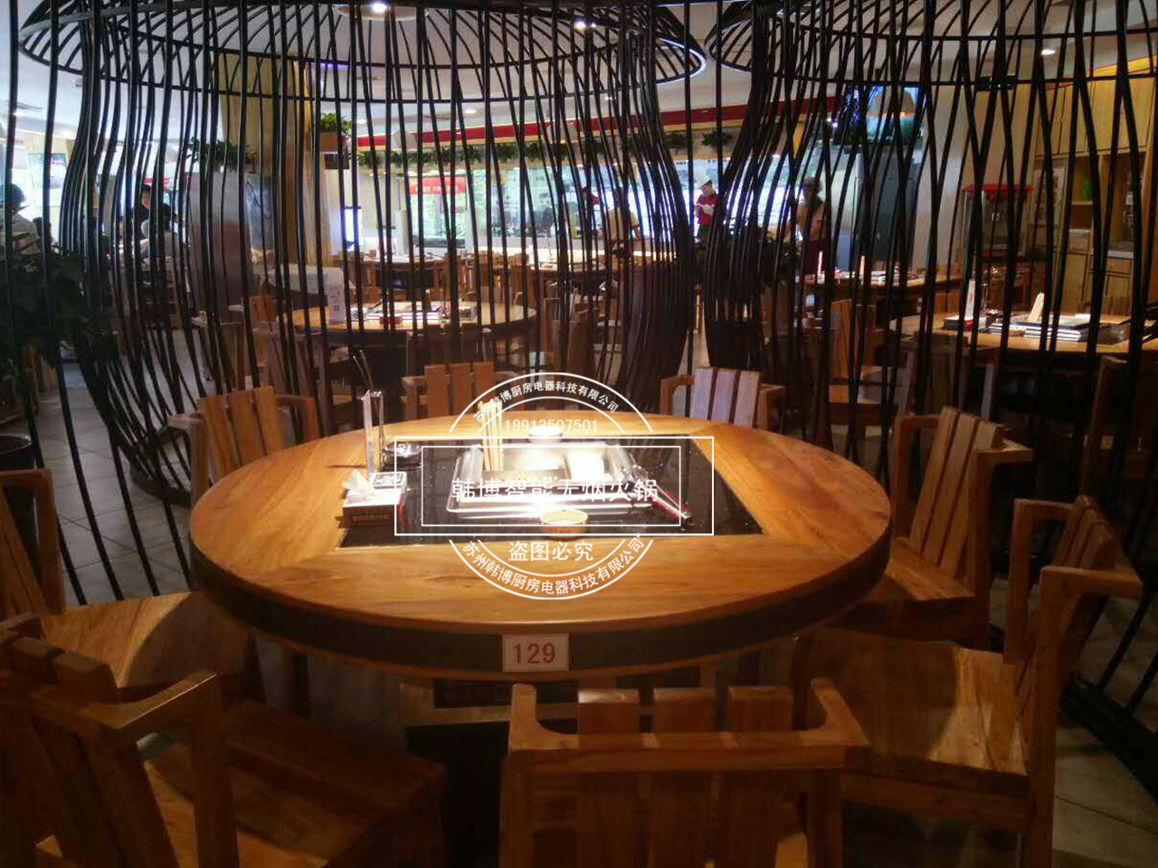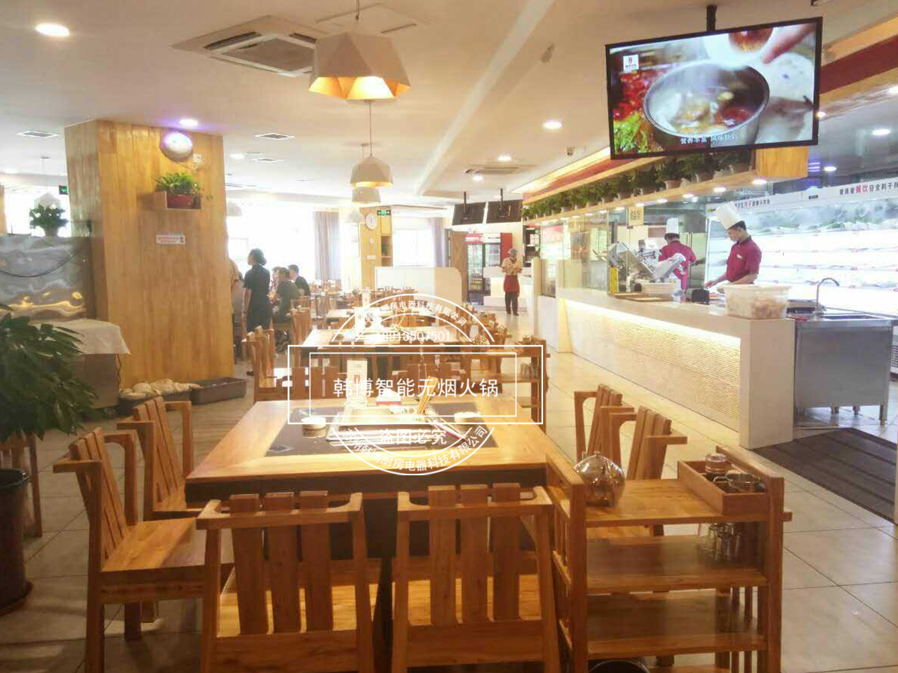 店內(nèi)特別之處就是老板從韓博定制的智能無(wú)煙火鍋凈化設(shè)備,安裝在了每張桌子下面,因?yàn)槲蜔熉蔬_(dá)到了99%,所以前來(lái)吃火鍋的顧客,再也不用擔(dān)心受到油煙味的困擾。